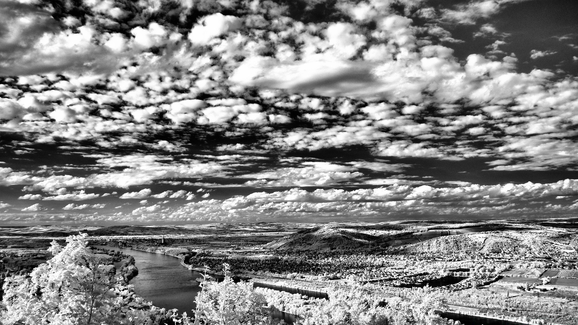 Foto en blanco y negro del paisaje en invierno río y colinas desde una altura